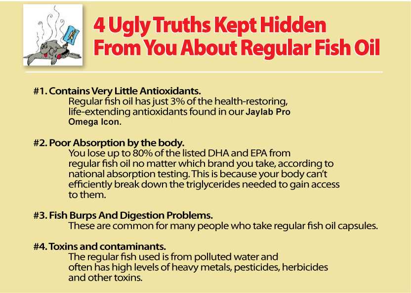 Besides fish oil being less absorbable by your body, fish oil contains only 3 percent of the life-extending antioxidants your body needs.